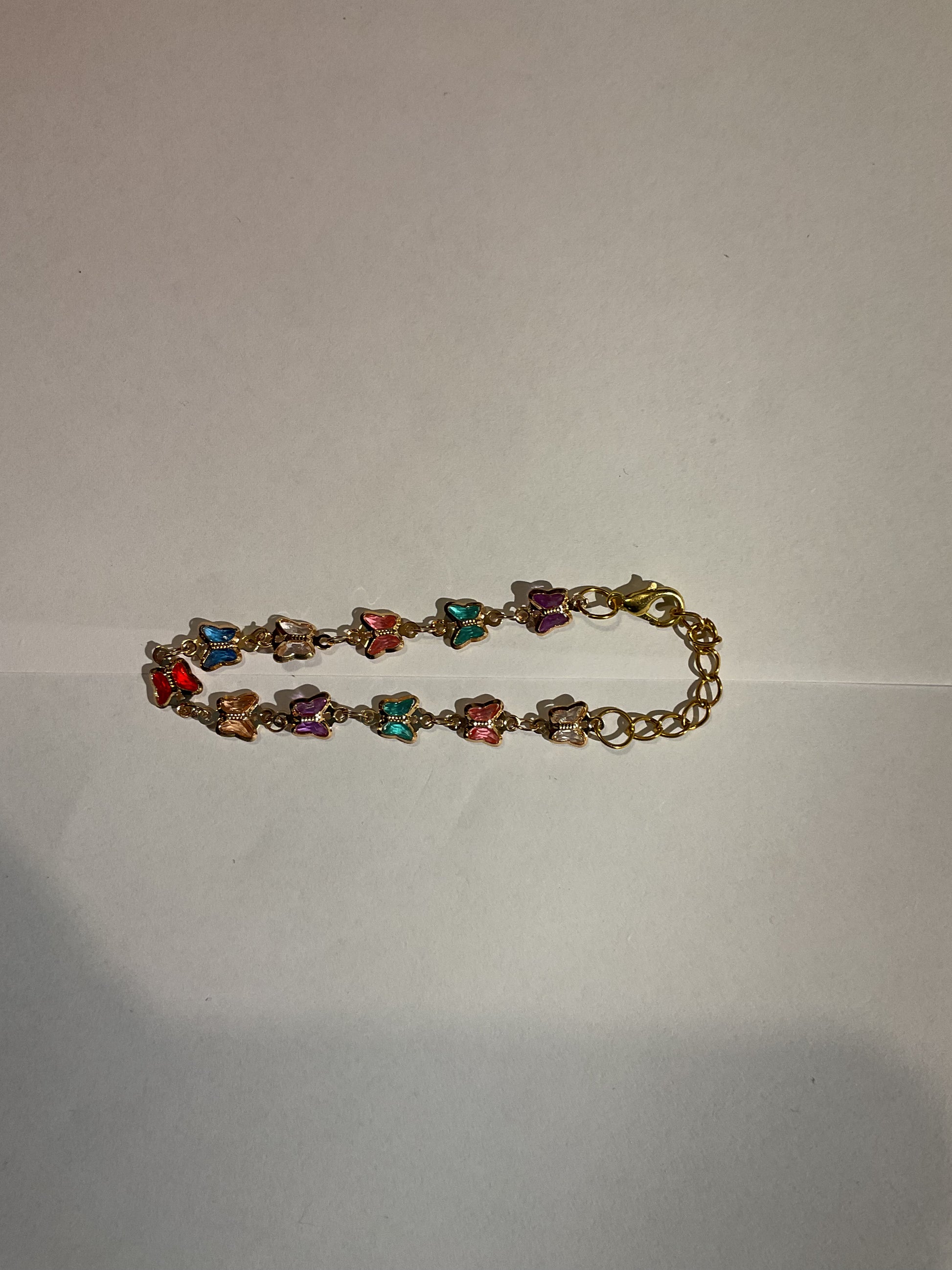 Armband i guld metall och fjärilar i glas i olika färger.Mät handleden och lägg till lite så det sitter som ni vill ha det.