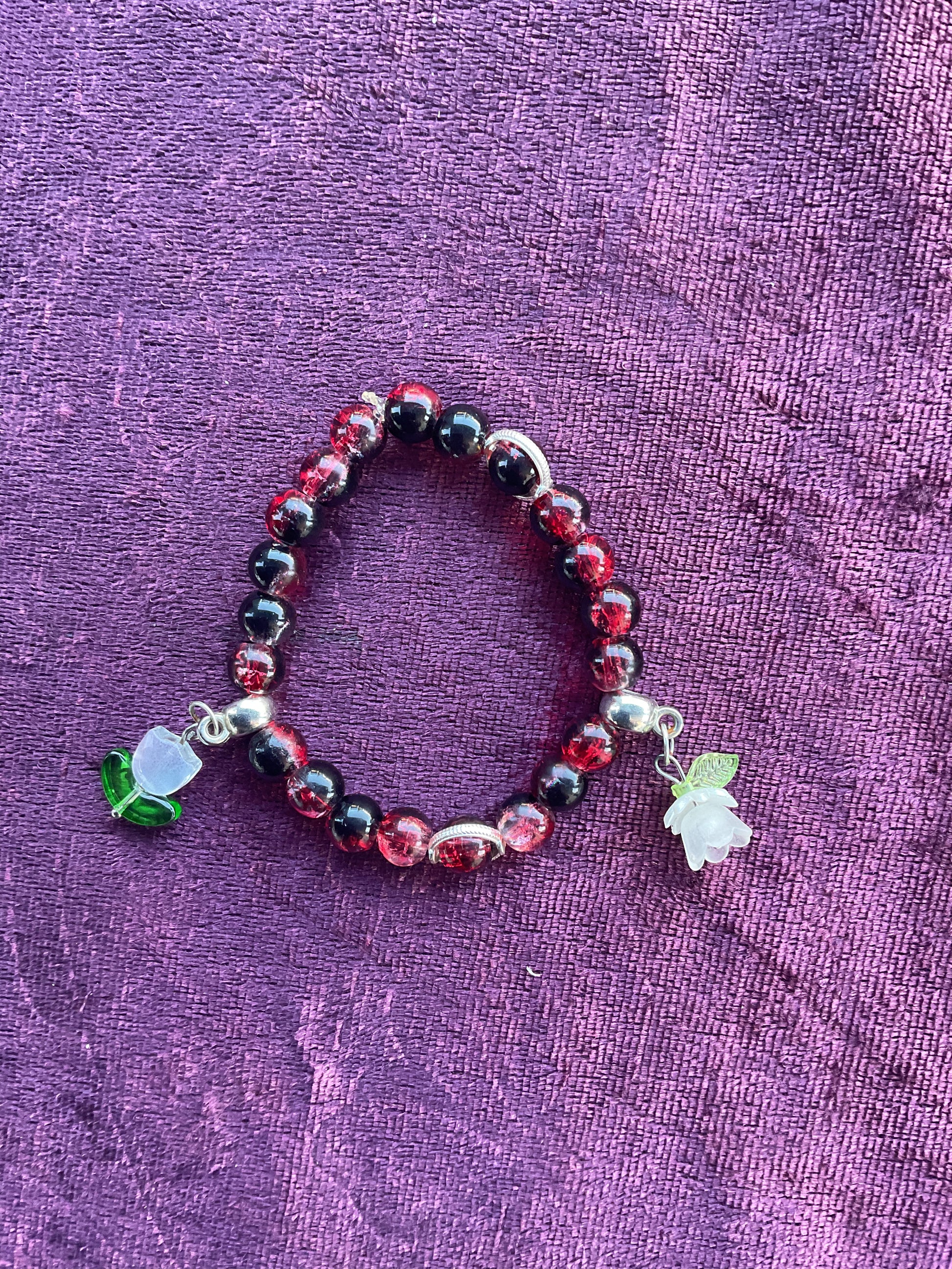 Armband på elastisk nylontråd. 15-18 cm. Krackelerade glaspärlor i rött och svart. Med två berlocker.