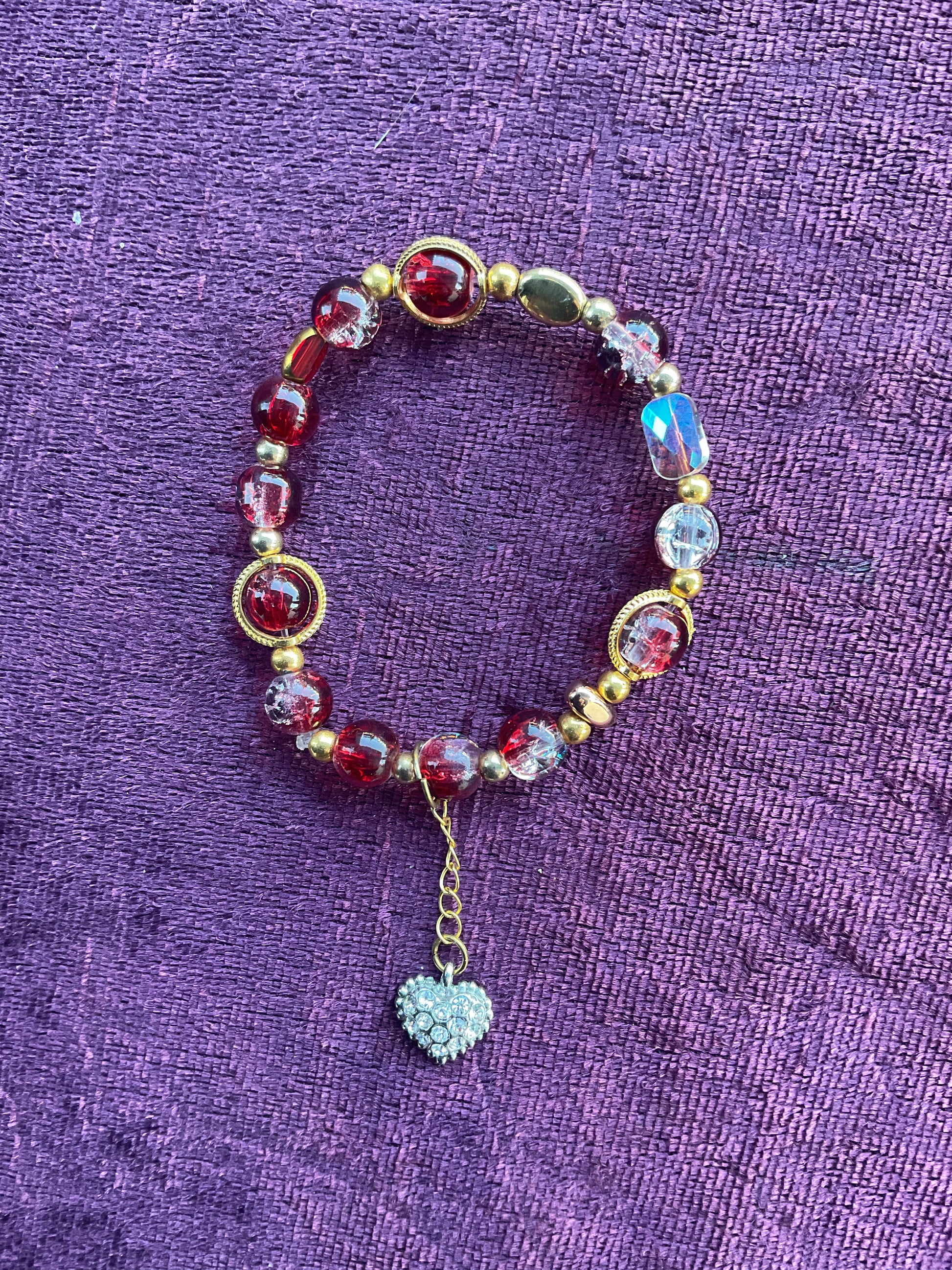 Armband på elastisk nylontråd. Med krackelerade pärlor i rött, genomskinligt och guldfärgat. 15-18 cm.