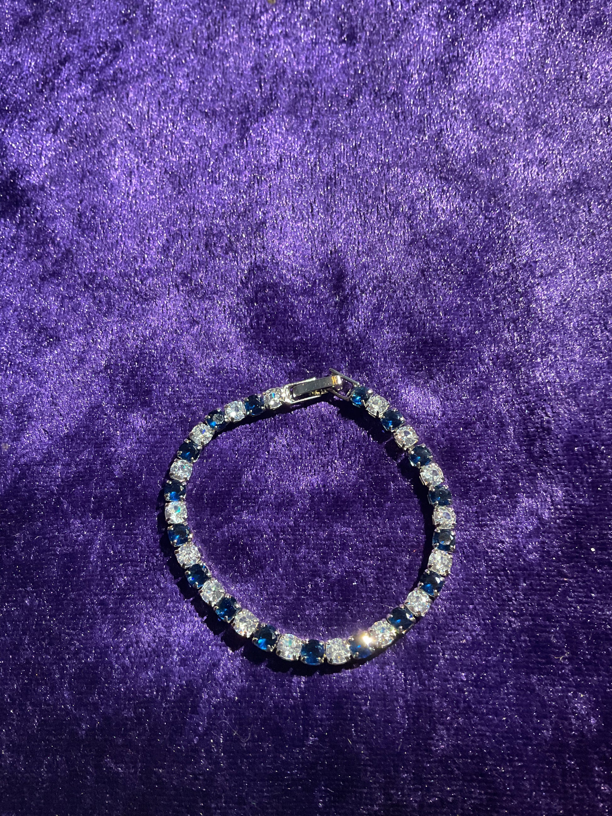 Armband i rostfritt stål med slipade glasinfattningar i blått och vitt. 15,5 cm. Vikt 5,7 gram.