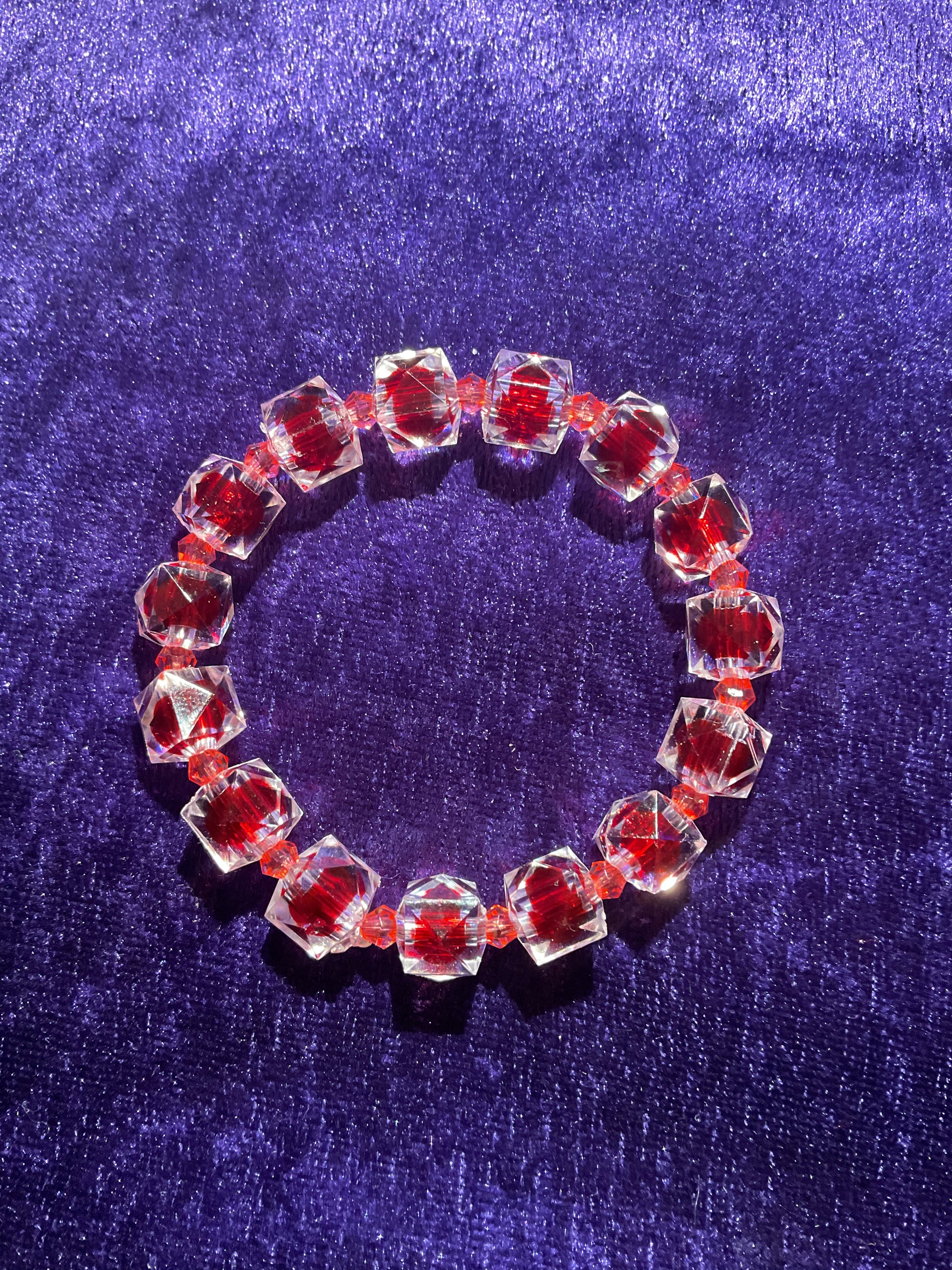Armband glaskub röd på elastisk nylontråd från 15 cm.