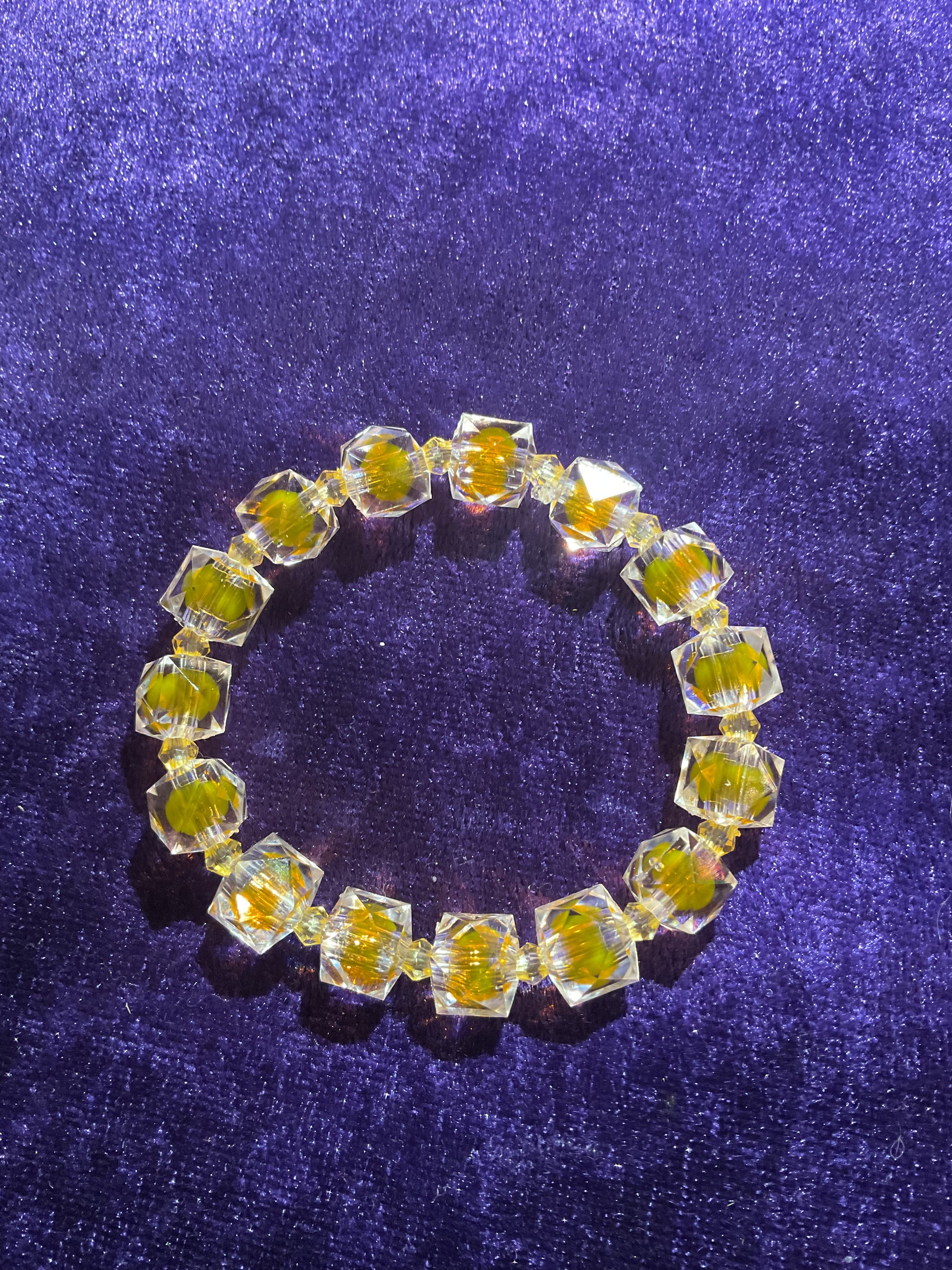 Armband med ljusgula glaskuber på elastisk nylontråd från 15cm.