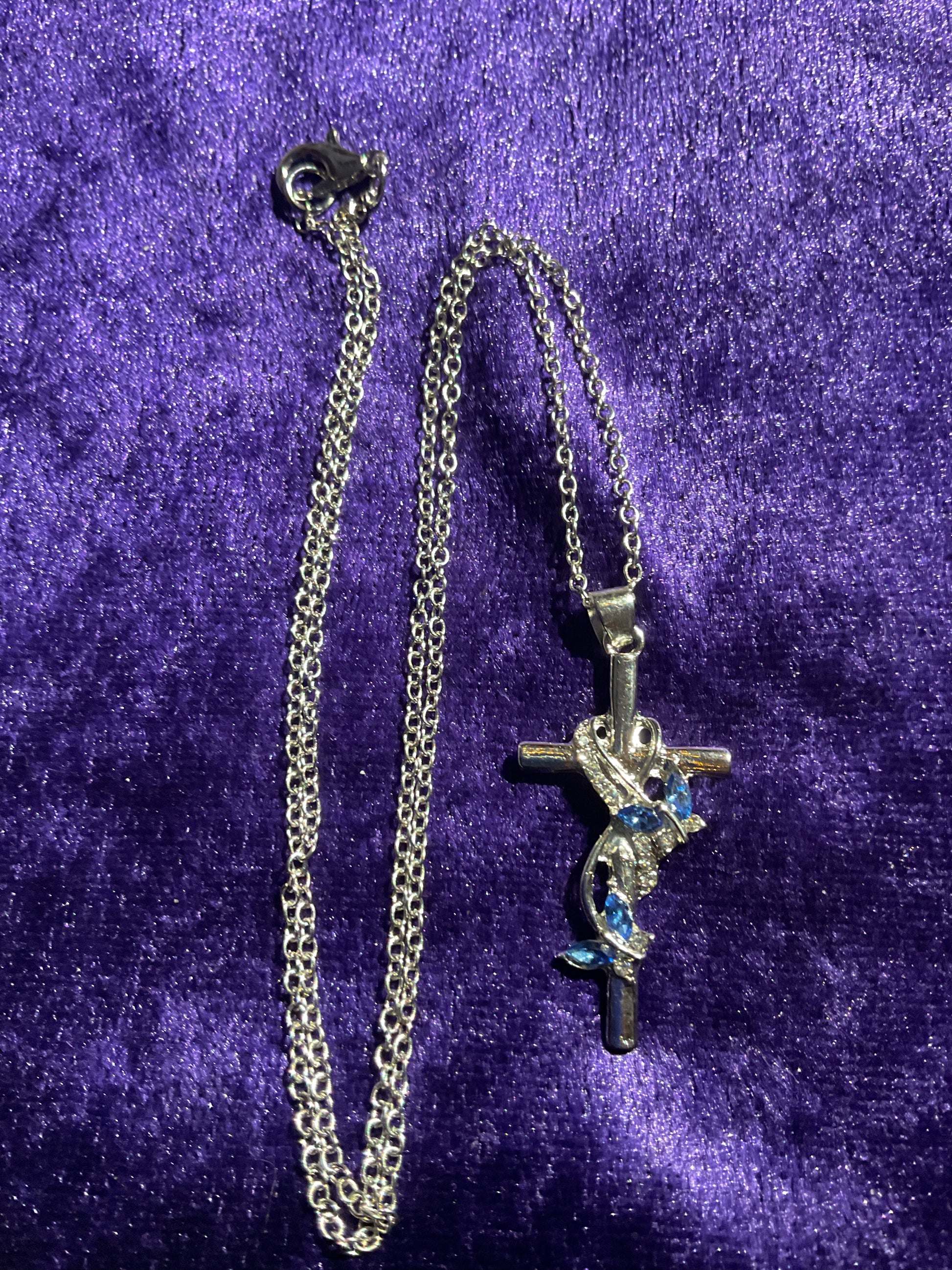 Halsband, hänge. Rostfritt stål silverfärgat med blå slinga med blå slipade glasbitar.