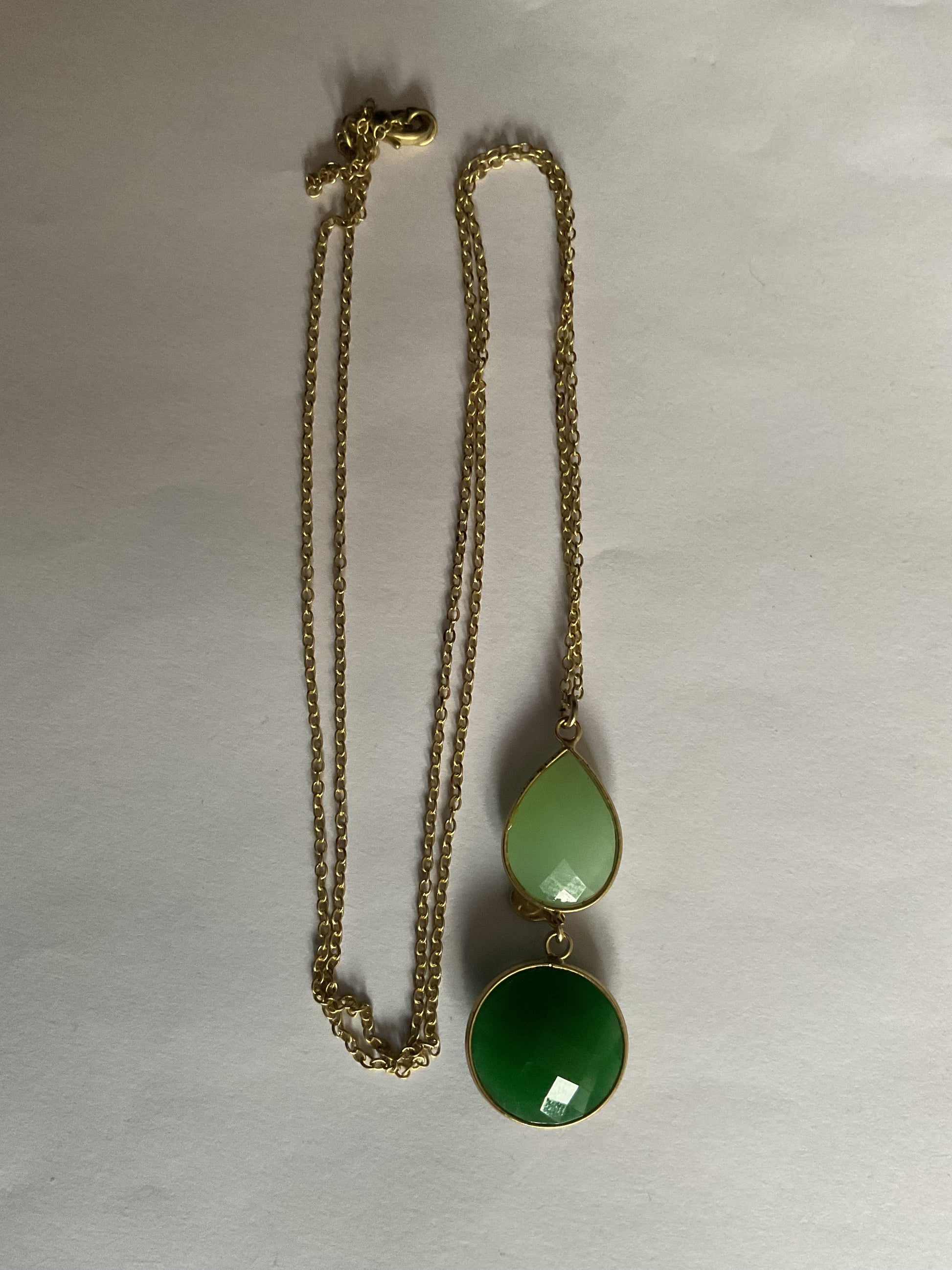 Halsband i guld metall med gröna slipade glasinfattningar.