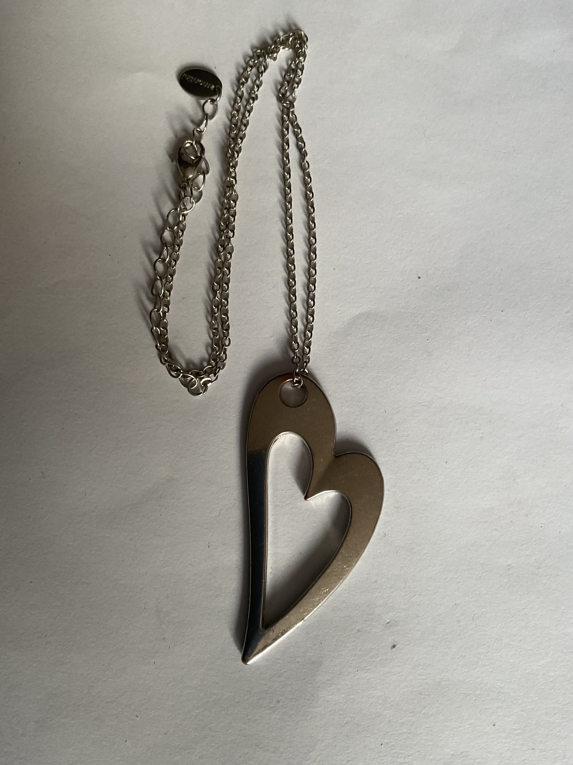 Hänge i silverfärgad hjärta 6x3 cm. Med kedja 40 m. Och förlängningskedja 5cm.