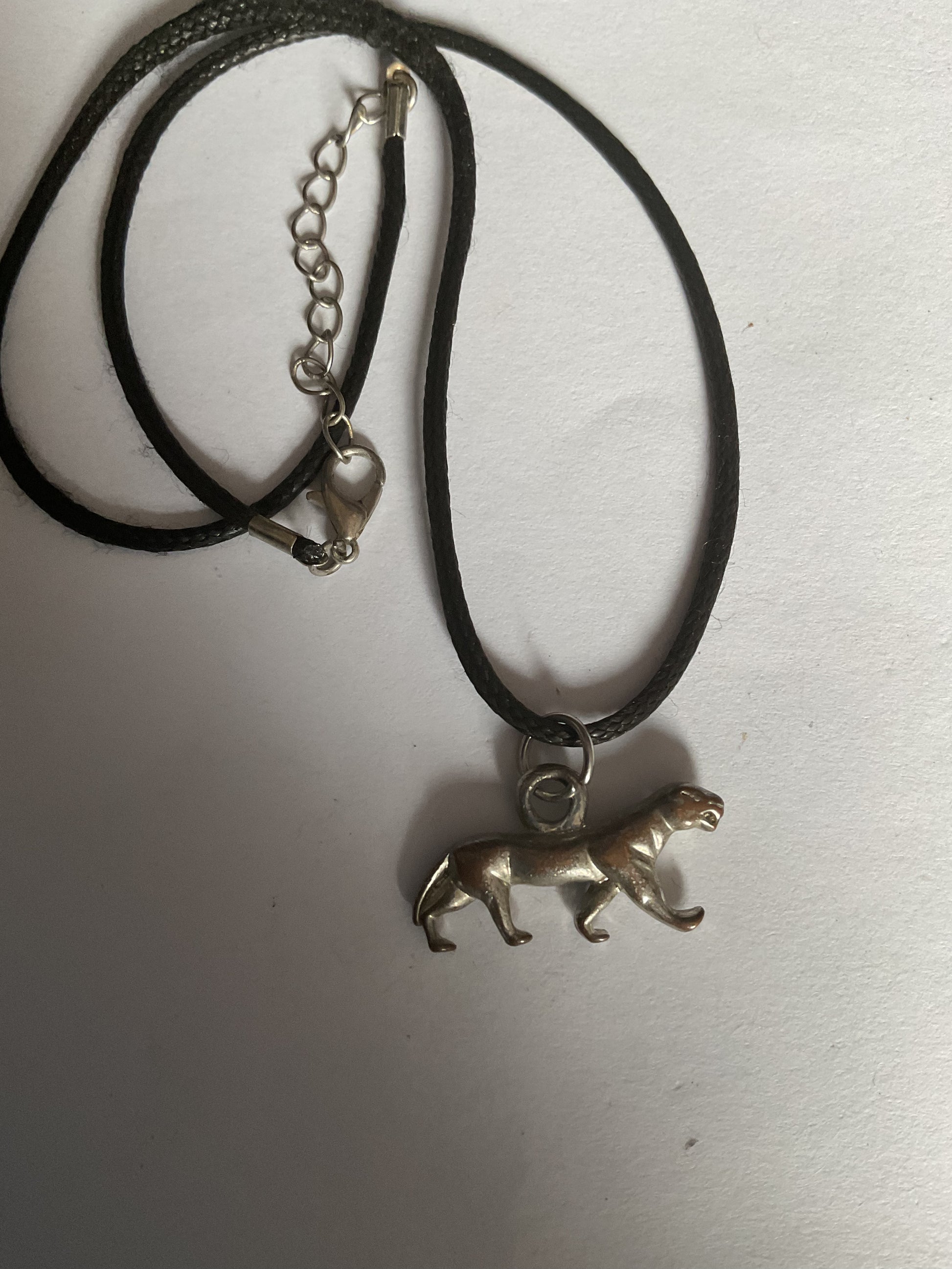 Halsband, hänge panter i silverfärgad metall 3x1 cm, rem 40 cm med förlängningskedja 5cm.