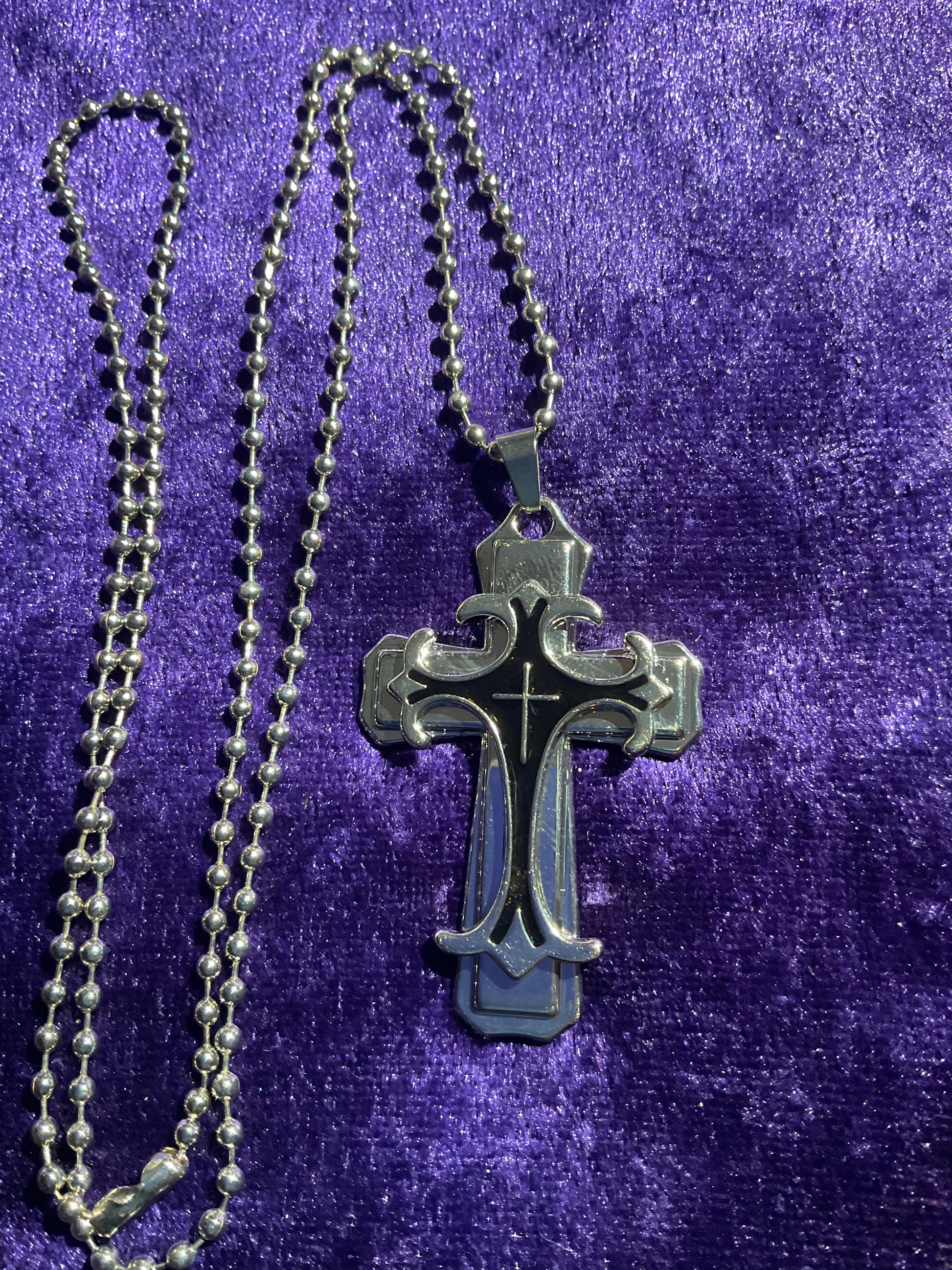 Hänge kors i rostfritt stål. Svart kors 5cm högt kedja 60 cm. 16,6 gram.