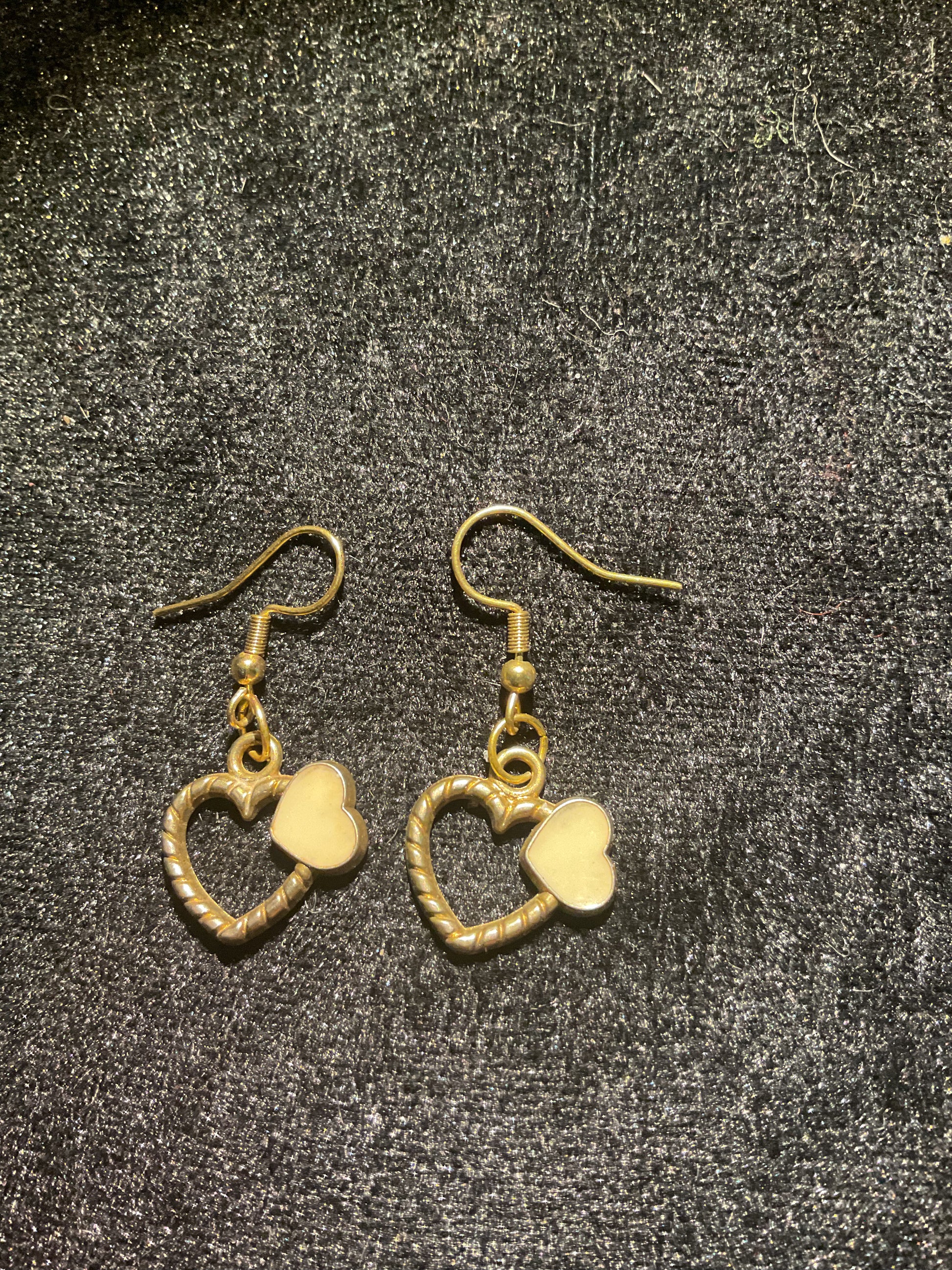 Örhängen i guldfärgad metall i form av två hjärtan.